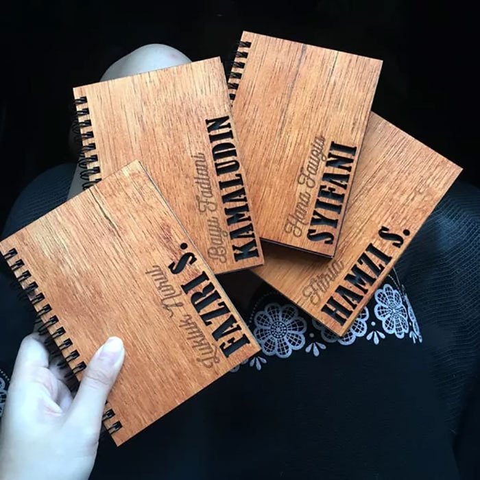 Selain tumbler, sebagai salah satu jasa laser grafir Surabaya, Laserfox juga merekomendasikan notebook grafir seperti ini sebagai hadiah untuk tamu undangan acara pernikahan atau wedding ceremony. Notebook juga nggak kalah penting dari tumbler. Buku catatan satu ini tentunya akan sering digunakan, khususnya apabila tamu undangan anda mayoritas merupakan para pekerja. Mereka akan membutuhkan notebook untuk setiap meeting ataupun melakukan pencatatan list pekerjaannya di kantor. Notebook seperti pada gambar berikut merupakan notebook hasil laser grafir pada covernya, lho! Cukup unik dan eksentrik yah! Sertakan nama anda dan pasangan beserta tanggal pernikahan, atau mungkin sebuah quote tentang cinta, dijamin bikin tamu undangan berkesan dengan souvenir acara wedding yang melankolis seperti ini.