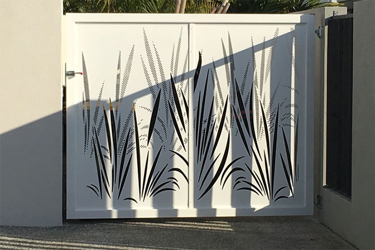 Berikutnya, inovasi pattern pagar laser cutting dengan motif semak-semak. Sizenya yang cukup minimalis dan warnanya yang putih menonjolkan keunikan dari pagar tipe ini. Dan bentuknya yang menjadi dua pintu juga menjadi keunikan berikutnya.
